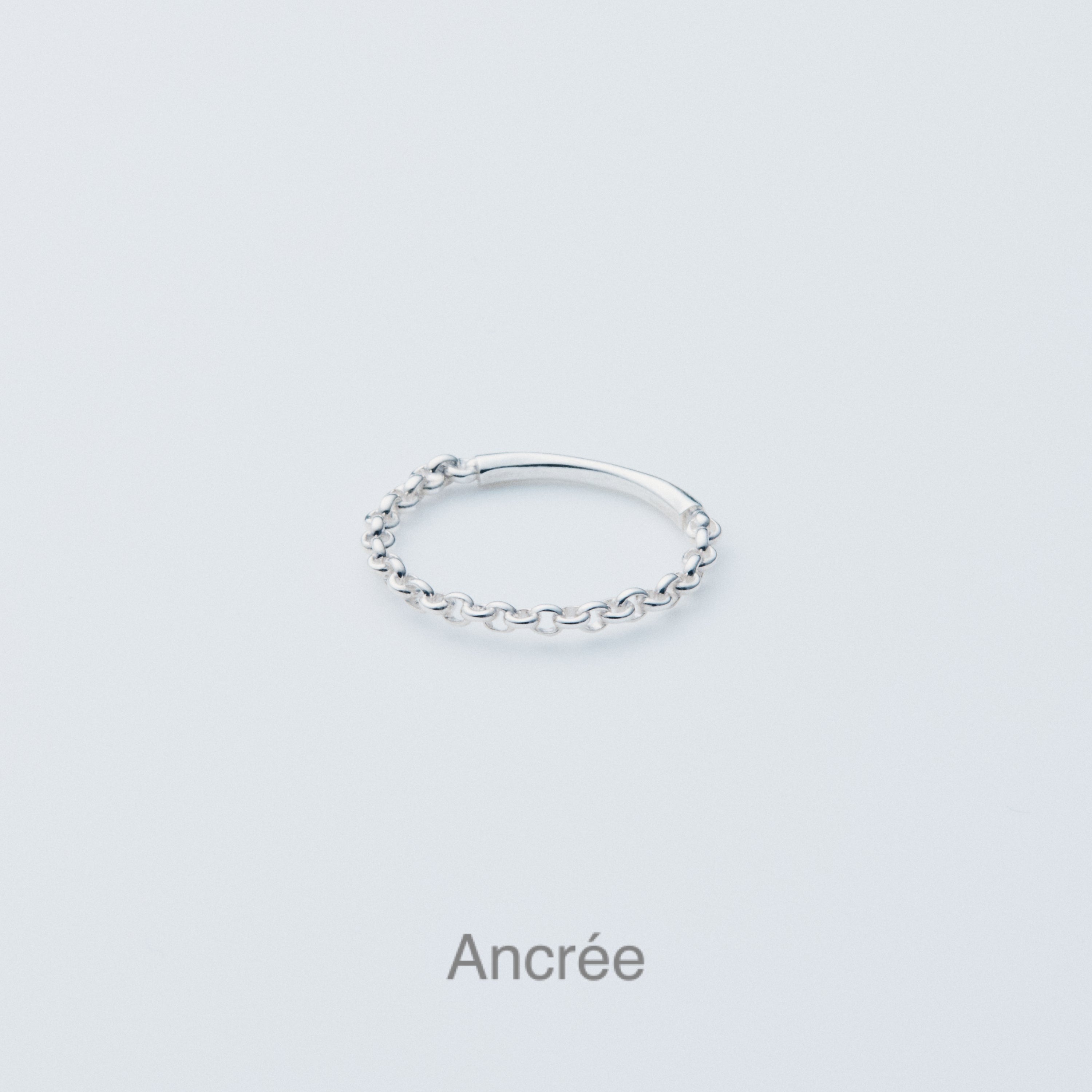 細い地金と繊細なチェーンが指に寄り添い、余白を美しく保ちながら、さりげない存在感を添えるリングです。