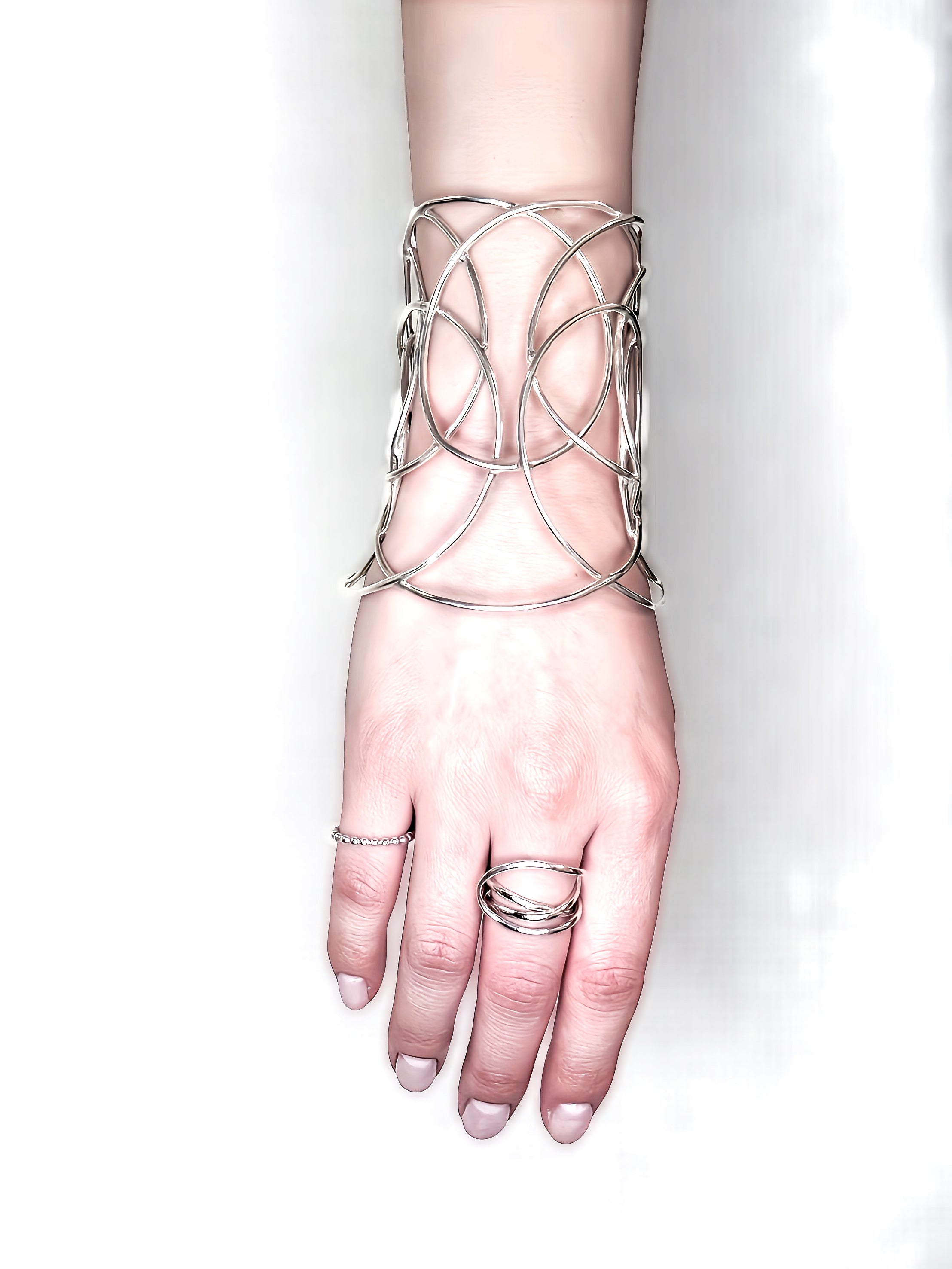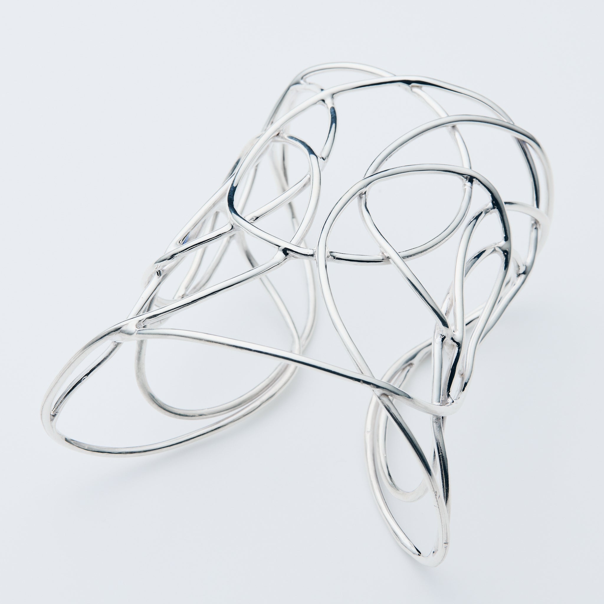 腕まわりの約3分の1を包み込む構築的なデザインは、圧倒的な存在感を放ちながらも、細く繊細なラインによって軽やかに仕上げられており、日常にもすっとなじみます。